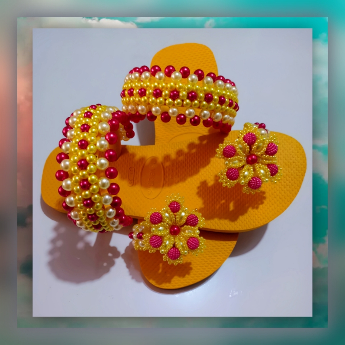 O que era um chinelo Havaianas Top se transformou em uma linda sandália rasteira, feita à mão com criatividade, bom gosto e muito estilo! Na vibrante cor amarelo, essa peça ganhou vida com a aplicação de pérolas lisas e craqueladas nas cores amarelo e vermelho, criando um contraste cheio de personalidade e alegria.